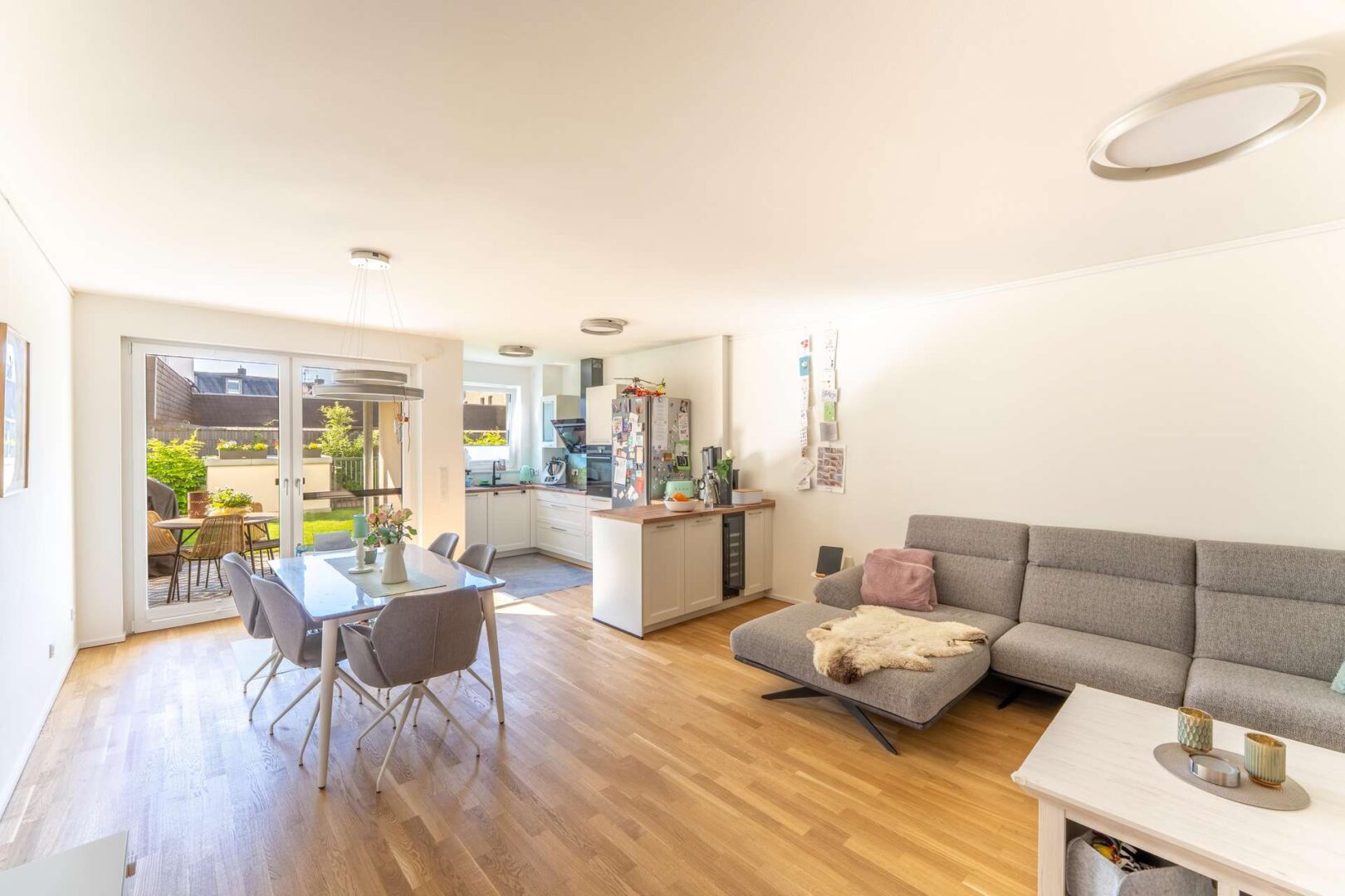 Im stilvollen Neubauensemble, das durch die gelungene Verbindung von moderner Architektur und traditioneller Baukultur besticht, erwartet Sie mit dieser exklusiven 104 m² große Erdgeschosswohnung mit Garten in Südausrichtung, ein barrierefreies offenes Wohnkonzept mit lichtdurchfluteter Wohnküche, zwei komfortablen Schlafzimmern, Hauswirtschaftsraum und zwei eleganten Badezimmern.