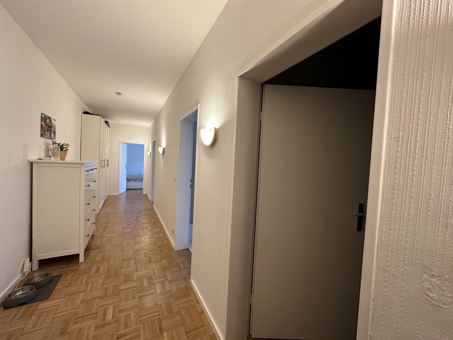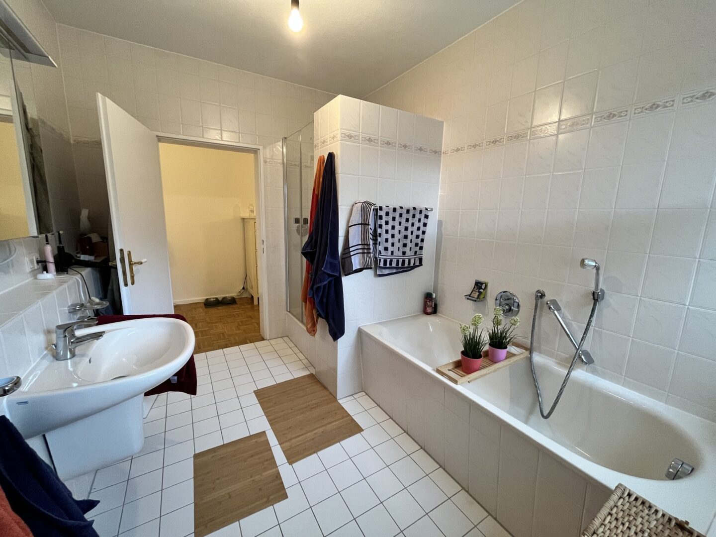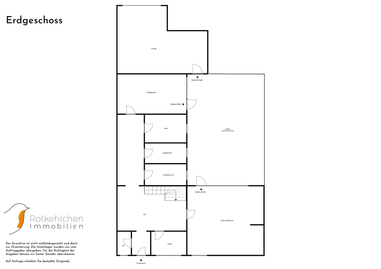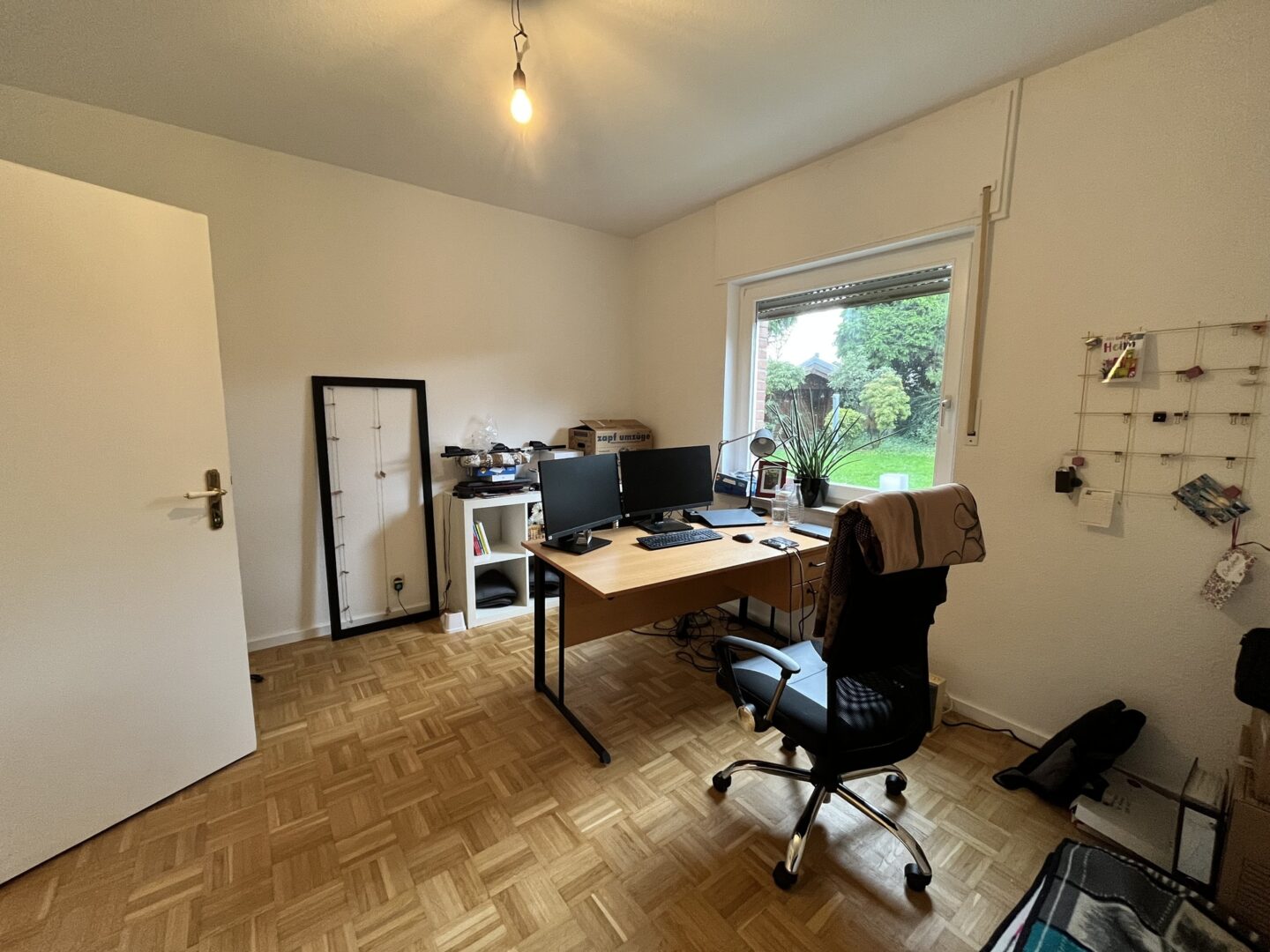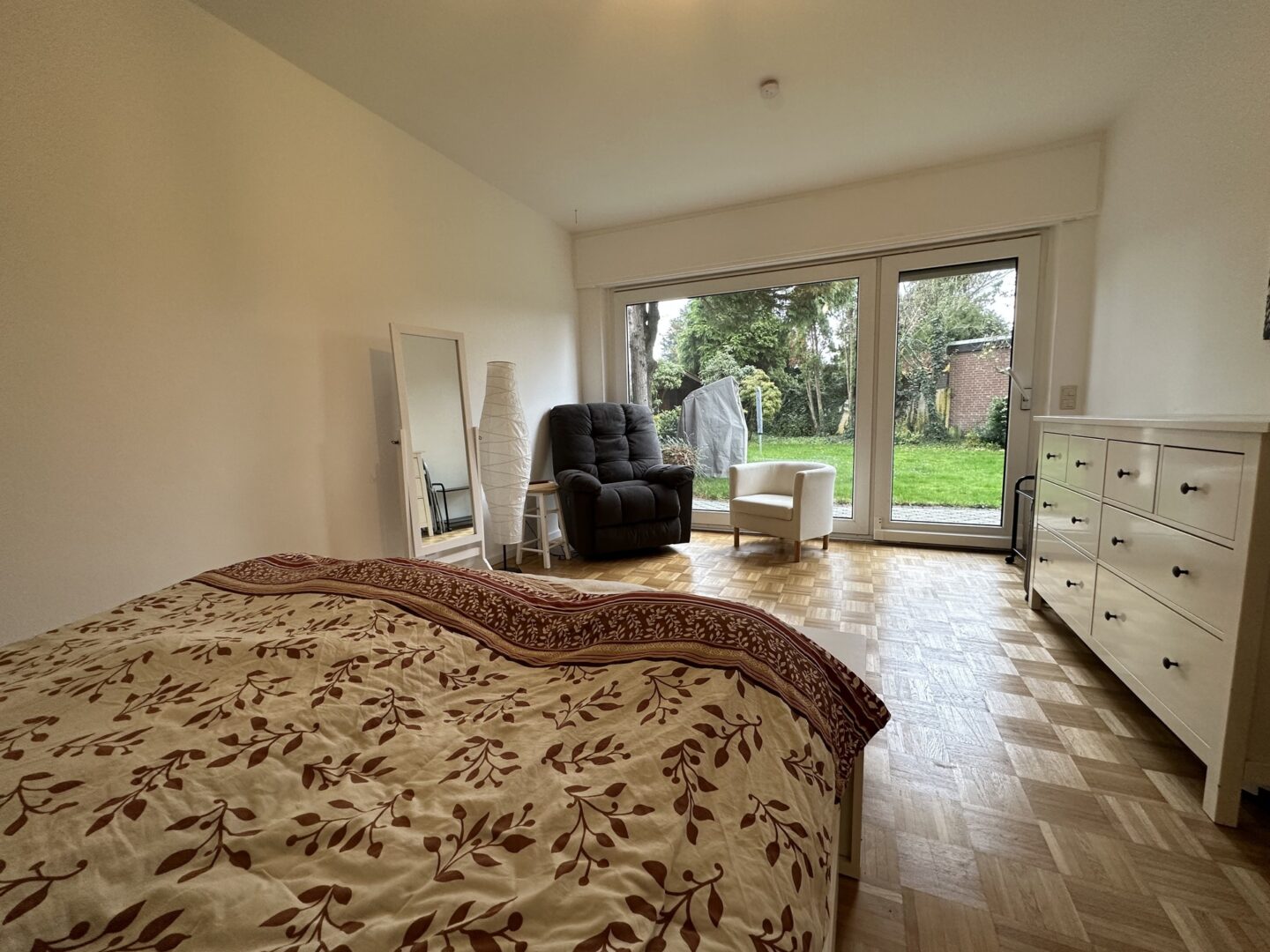 Im hinteren Bereich befinden sich die Garderobe, das Tageslichtbad mit Dusche und Badewanne sowie das Büro. Am Ende des Flurs befindet sich das Schlafzimmer, von dem aus man wiederum den herrlichen Blick in den eigenen Garten genießen kann. Dank Ostausrichtung wird man hier von der Sonne geweckt. Sämtliche Wohnräume überzeugen mit Parkettböden und Fußbodenheizung.