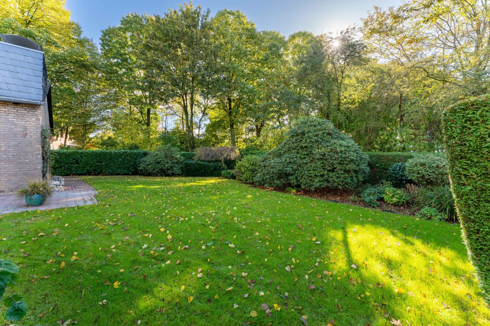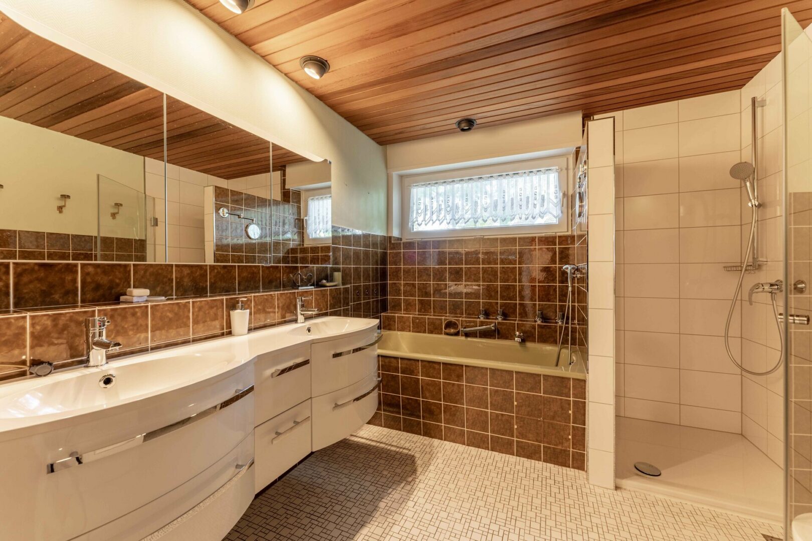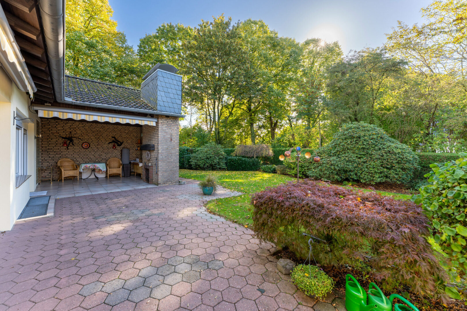 Ein besonderes Highlight ist der traumhafte Blick, den Sie von jedem Raum aus in den liebevoll angelegten Garten genießen können. Große Fensterfronten lassen viel Tageslicht herein und schaffen eine Verbindung zur Natur. Im Wohnzimmer können Sie dank großer Schiebeelemente Garten und Wohnraum direkt miteinander verbinden. Der Garten ist umringt von einem üppigen Baumbestand und lädt geradezu dazu ein, die Natur in vollen Zügen zu genießen. Sei es beim Entspannen auf der Terrasse oder gemeinsamen Essen am Kamin im überdachten Außenbereich. Durch die optimale Ausrichtung nach Süden findet man im Garten sowohl am Morgen als auch am Abend einen Platz in der Sonne.