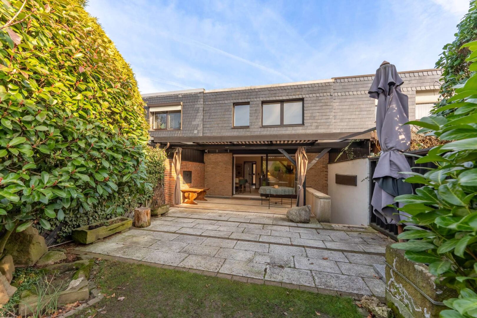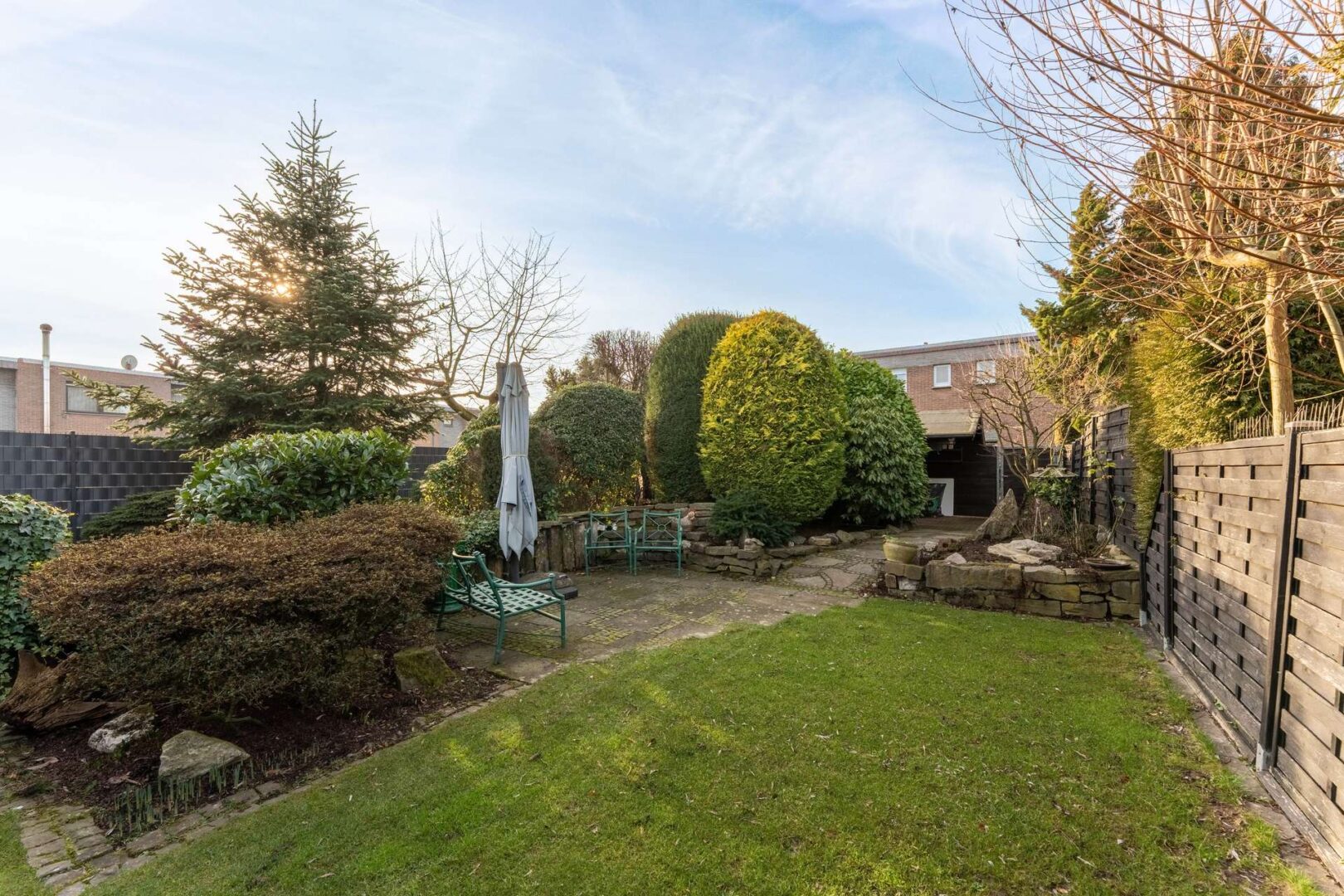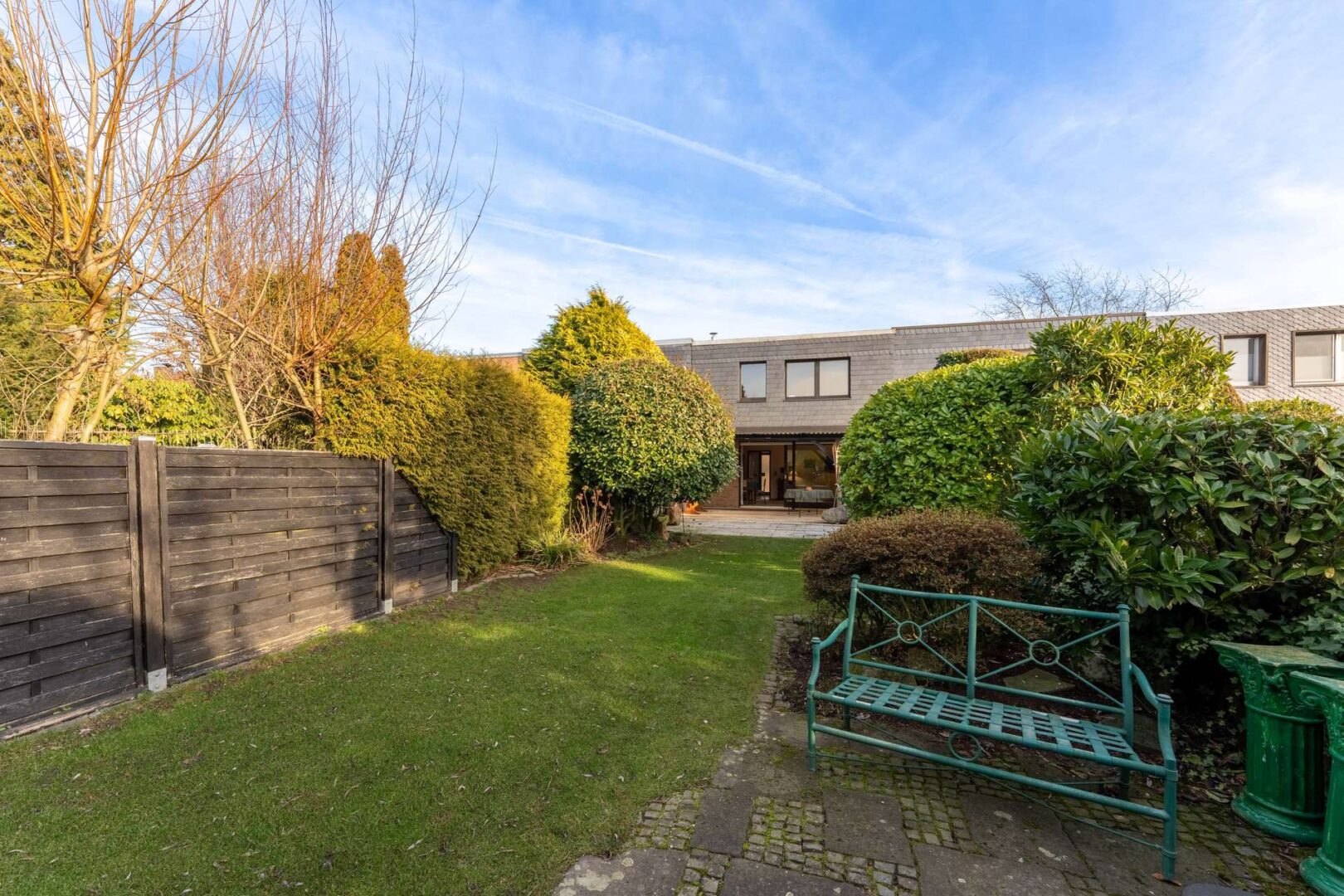 Am Ende des Gartens befindet sich zudem ein Ausgang, der sich ideal dafür eignet, Fahrräder oder Mülltonnen bequem zur Straße zu bringen.